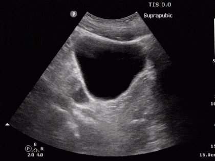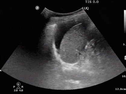 The presence of dark (black) fluid in any of these areas is presumed to be blood until proven otherwise. Identification of a fluid space between organs takes a keen eye. Evidence of fluid around the bladder suggests peritoneal bleeding or bladder rupture. The subxiphoid view also provides insight into cardiac injury, and subsequent pericardial effusion. Any evidence of fluid in any of these four locations is a positive result. Laparotomy is indicated when a positive fast is performed in an unstable patient.