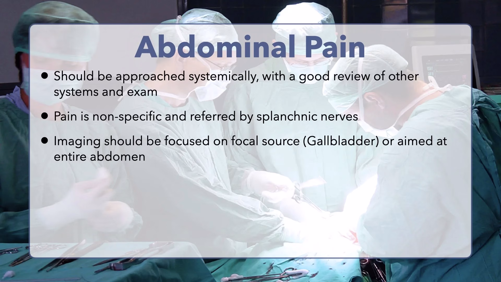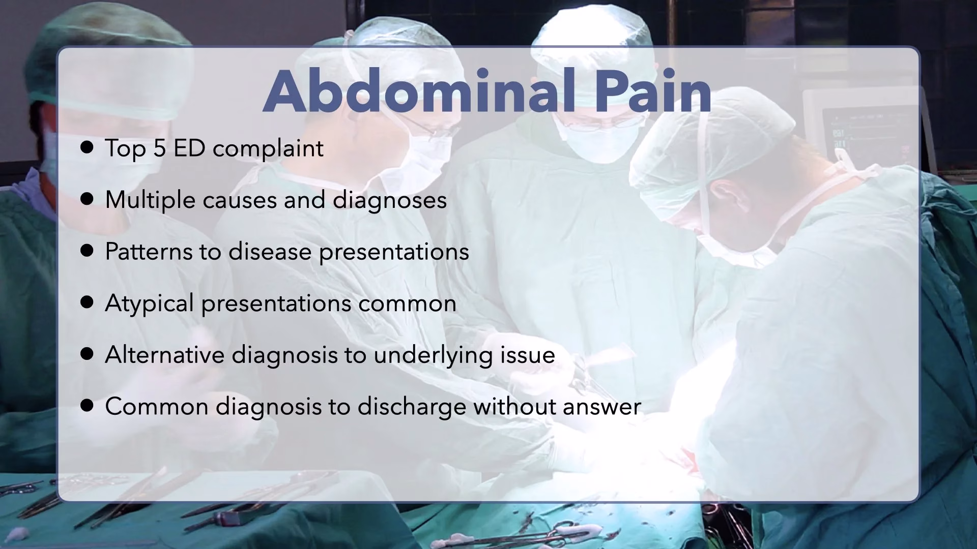 This topic is an overview of the general approach to abdominal pain in the emergency department setting. Applying this thought process will help with differentiating abdominal pain as emergent, acute, or safe for discharge. A thorough review of pain by abdominal location, and hernias is also discussed here.